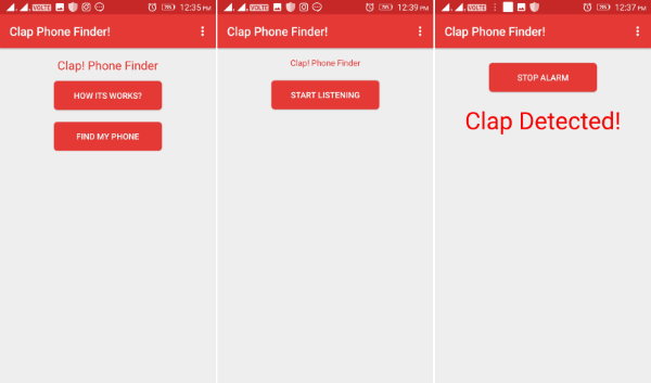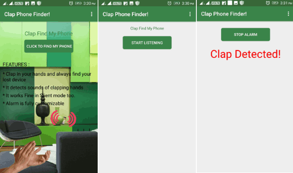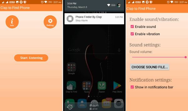 Clap to Find my Phone can also be used to find your Android phone just by clapping. To get started, simply open this app and then tap on the “Click to Find my Phone” button on the main screen. After you do that, you will see another button called “Start Listening” which you need to click to activate this app. Then you can minimize this app and it will start detecting your claps automatically. Whenever you clap, it will trigger an alarm on your phone in order to help you find it. This one can also vibrate your phone along with ringing the alarm.