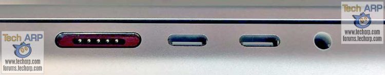 The photo on the left side shows a MagSafe 3 connector to begin with. It looks slightly different from its two predecessors: it is a lot flatter and now has five pins. You can’t actually put the cable in the wrong way, because it can also be clicked upside down. In addition to the MagSafe connector, you see two Thunderbolt 3 ports and a headphone jack.